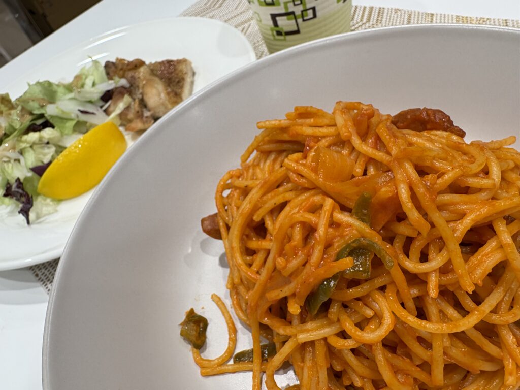 シェフご自慢のナポリタンと、ガラストップ両面焼きコンロのオートグリルで焼いたチキングリルチキン( *´艸`)