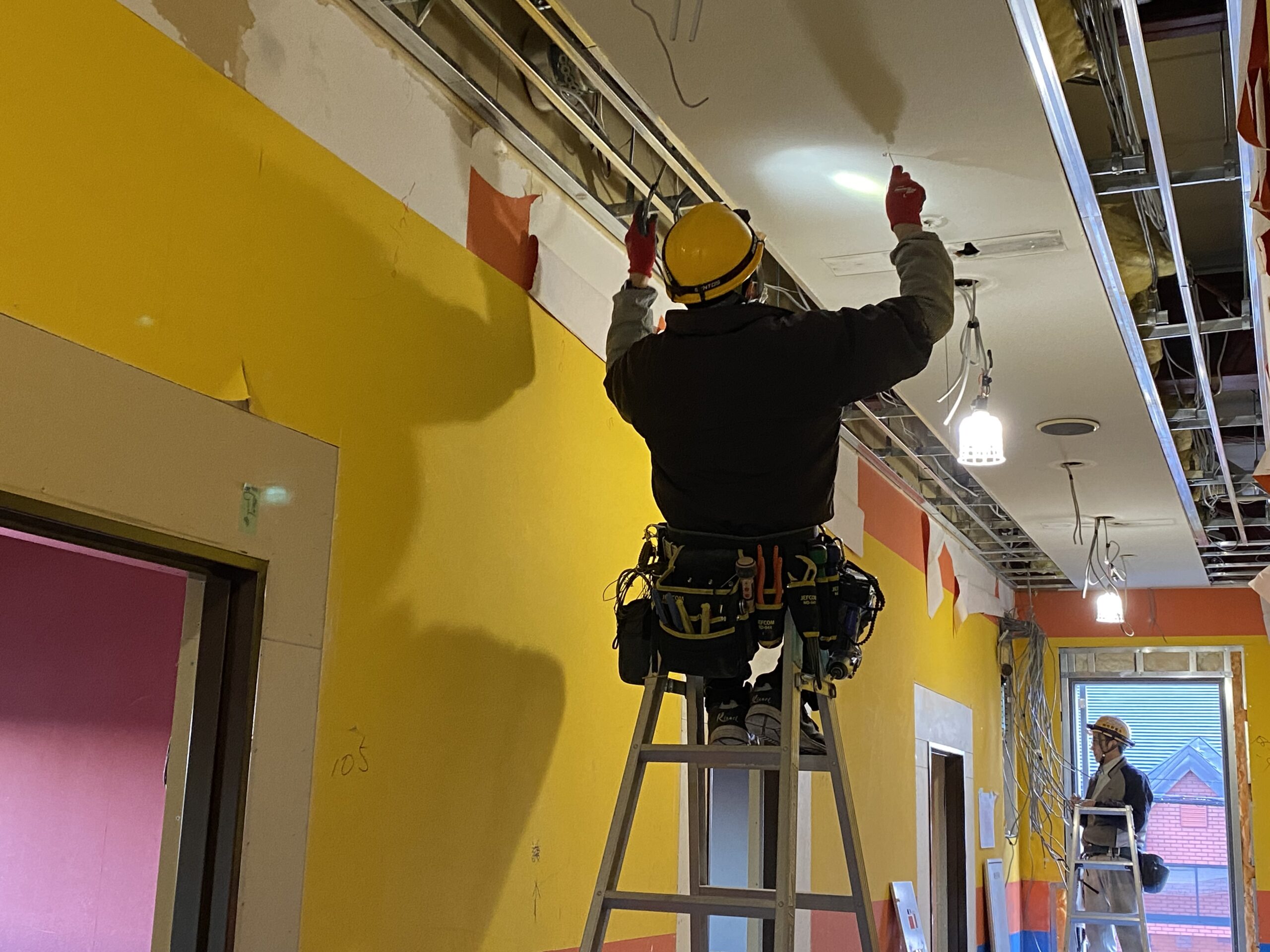 既存のまま生かす線、不要な線、新規に追加する線、、、天井材を残したたままの配線確認は大変そうです(;・∀・)