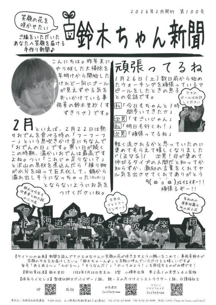 2026年2月発行の【鈴木ちゃん新聞】第100号です♪まだ2週間だけど珍しく頑張れていますヾ(≧▽≦)ノ