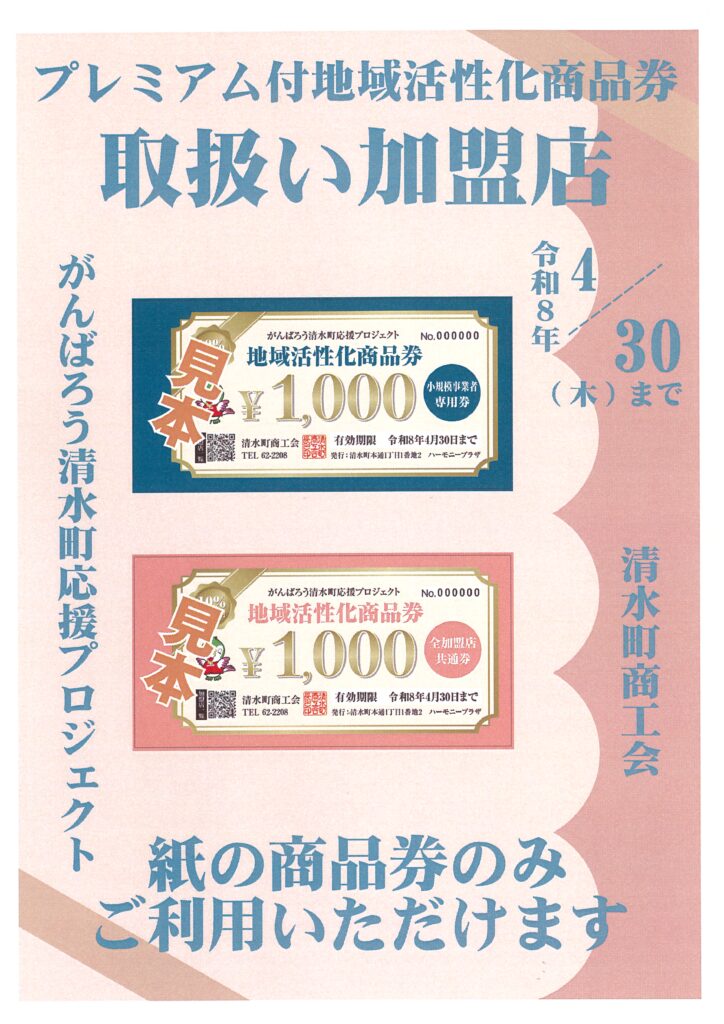 清水町内の景気回復・消費喚起を目的に販売されている清水町商工会発行のプレミアム付き商品券。